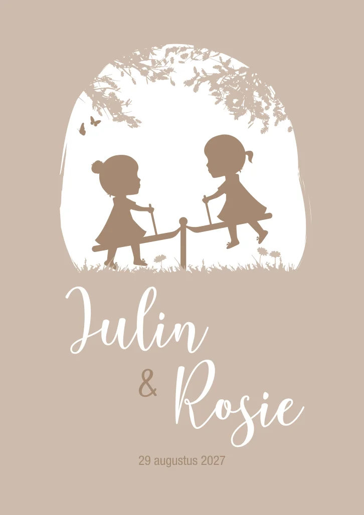 Een geboortekaartje voor een tweeling met een sprookjesachtig doorkijkje in beige tinten. Geboortekaartje Julin & Rosie is gemakkelijk aan te passen in kleur in de editor.