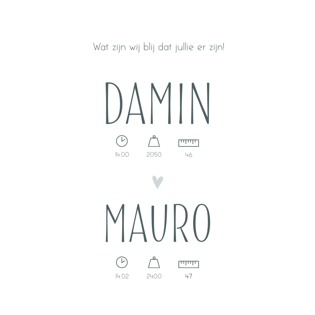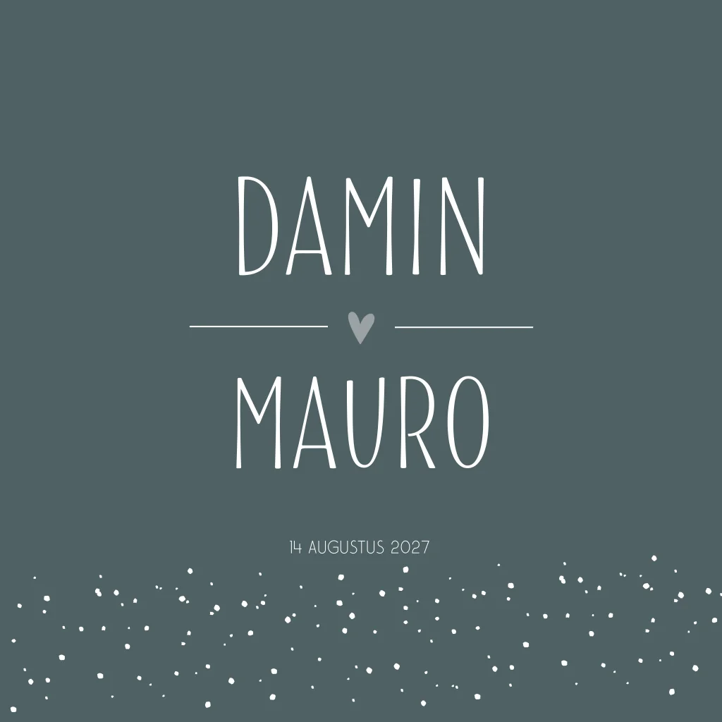 Geboortekaartje in oud blauwe kleur met witte letters en lichtgrijze hartjes. De subtiele stipjes op geboortekaartje Damin & Mauro maken het kaartje helemaal af.