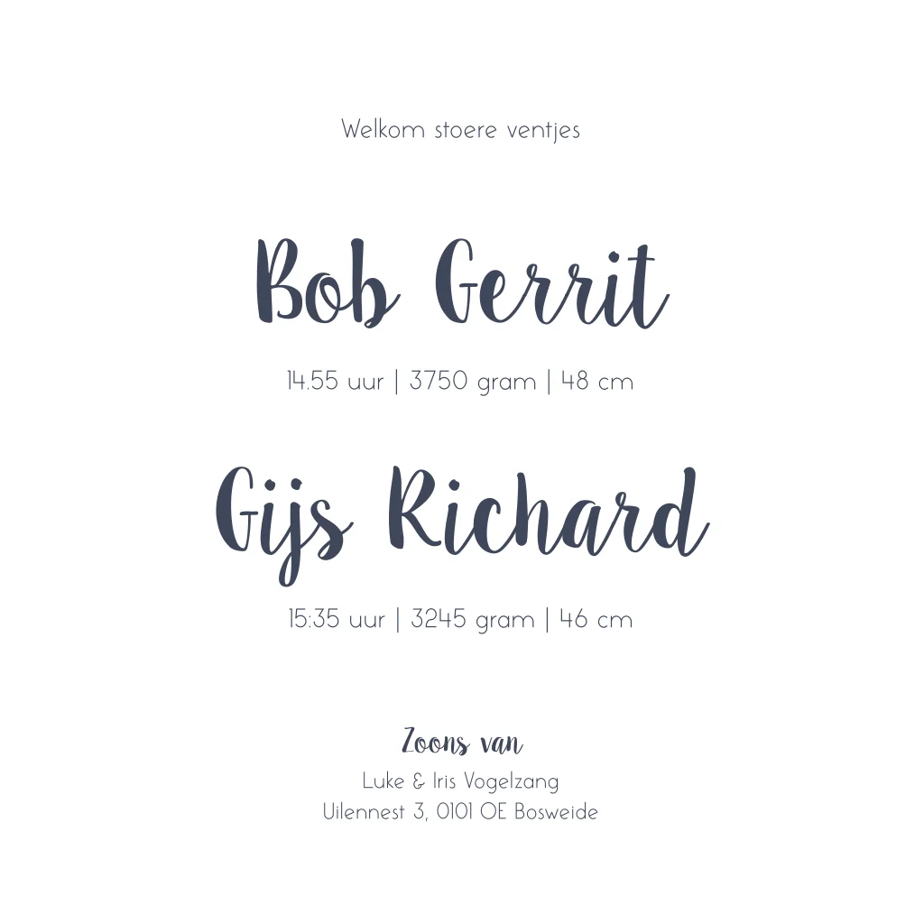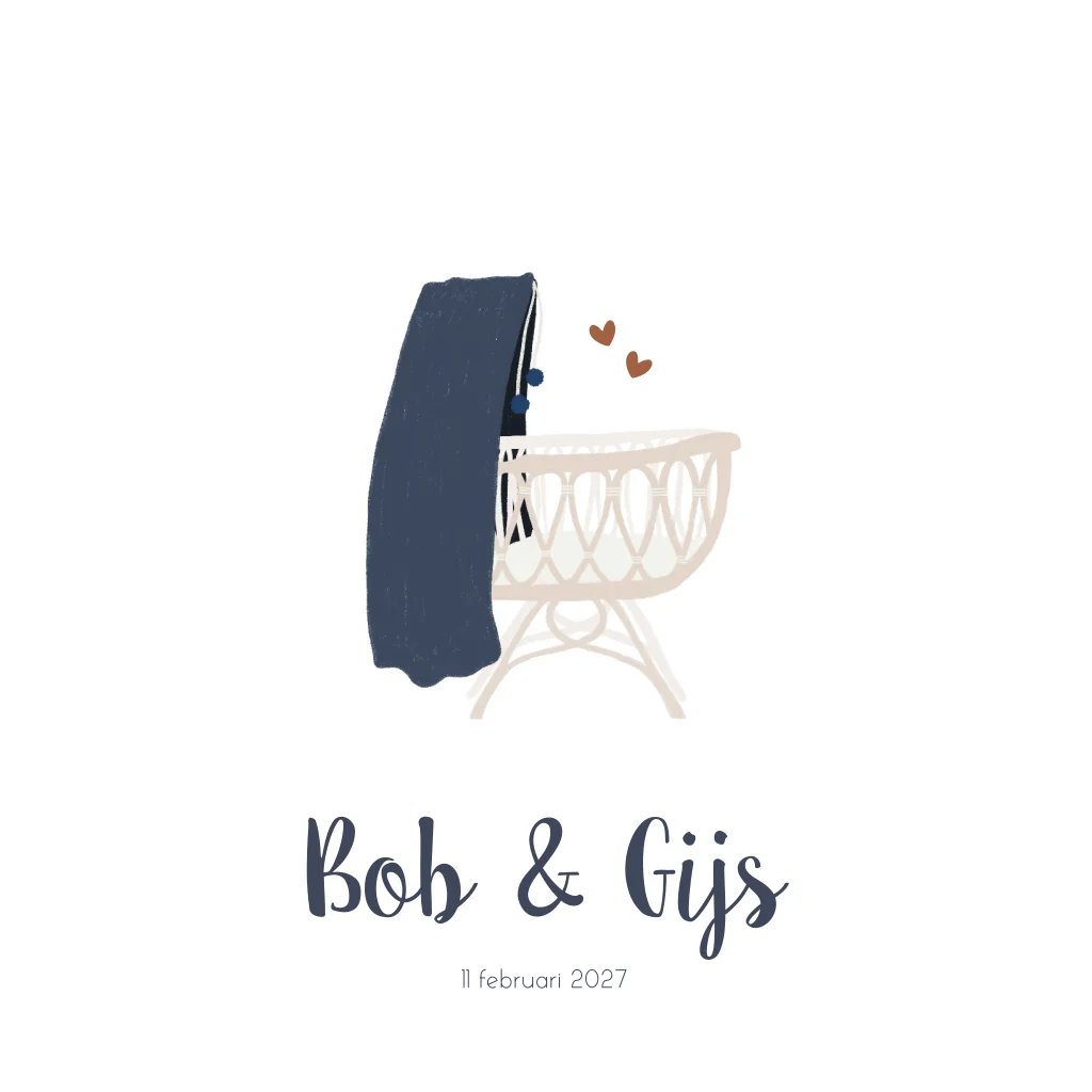 Schattig geboortekaartje voor jongens met een blauw wiegje. Geboortekaartje Bob & Gijs kan geheel aangepast worden in kleur & vormgeving.