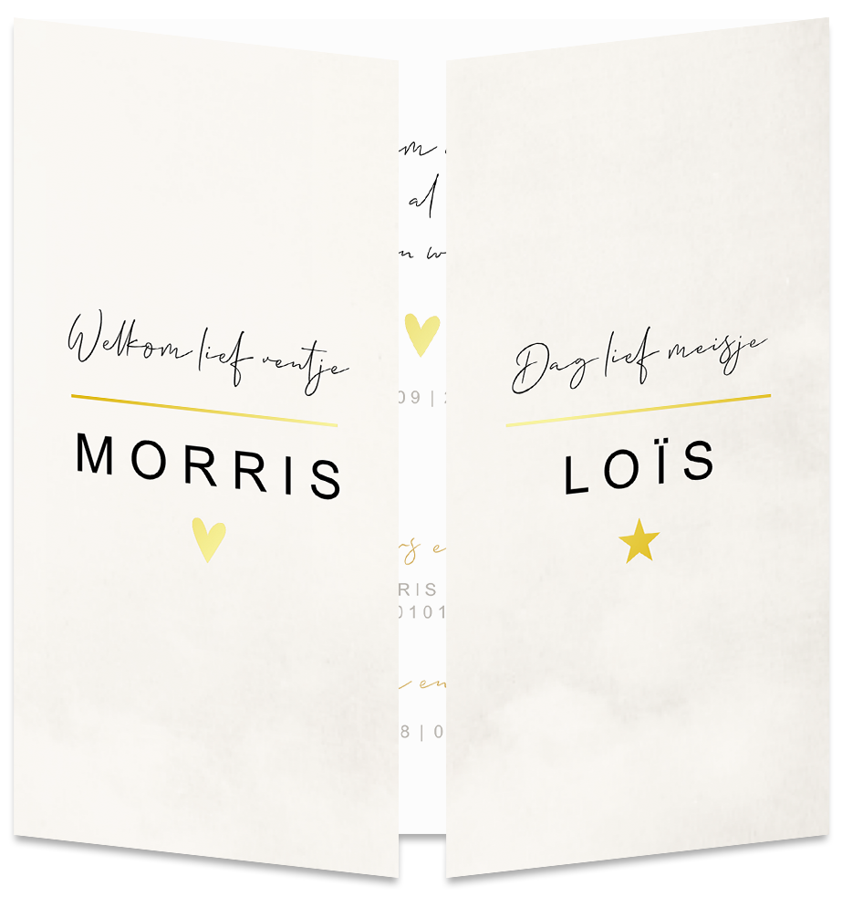 Een neutraal en strak beige geboorte-rouwkaartje voor een tweeling. Door de kleur is het kaartje genderneutraal, dus geschikt voor zowel een jongen als meisje. Dit ontwerp is een luikkaartje. Dit betekent dat het kaartje vanuit het midden opengaat. Zo heeft ieder kindje zijn eigen zijde van de kaart. Maar als je het kaartje weer dichtklapt zijn ze weer samen één geheel.