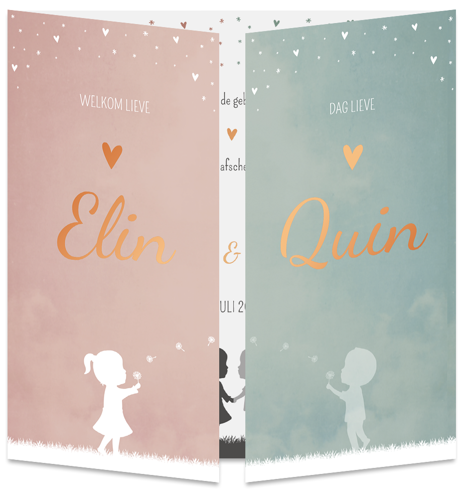 Een roze en groen geboortekaartje met een silhouet illustratie van een tweelingzus- en broer die paardenbloem pluisjes naar elkaar blazen. De silhouet van het jongetje is transparant afgebeeld omdat hij is overleden, maar voort leeft in de gedachten van dit gezin.