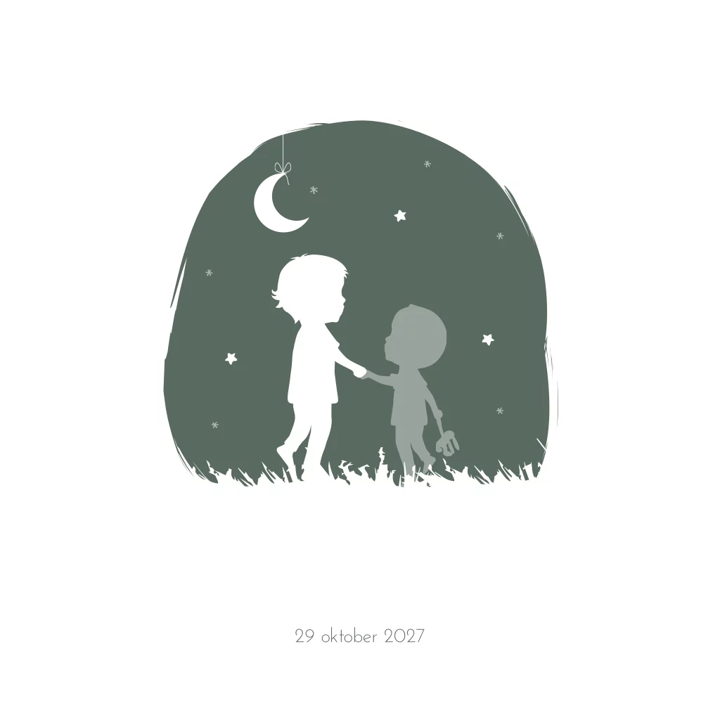 Dit is een indrukwekkende en confronterende rouwkaart maar meteen ook erg mooi doordat het precies het gemis laat zien door het silhouet van het kindje transparant te maken. Zijn grote broer houdt zijn hand vast. Ze zijn samen omgeven door sterretjes en een maan. De kleur van de kaart is wit, met emerald groene details.
