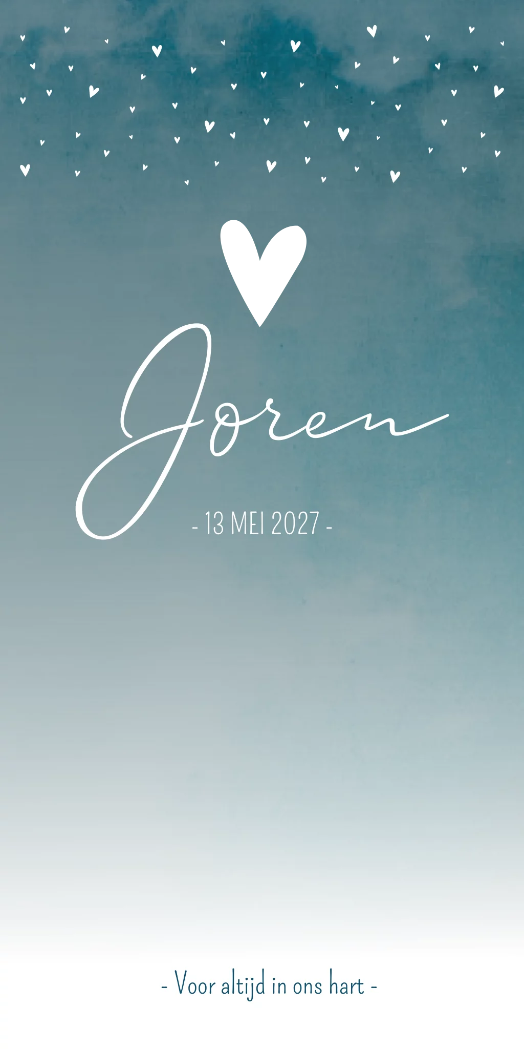 Een rustig blauw kaartje met hartjes en een kleurverloop naar wit. Kaartje Joren wordt nog mooier als je de grote hartjes met koperfolie laat bedrukken.