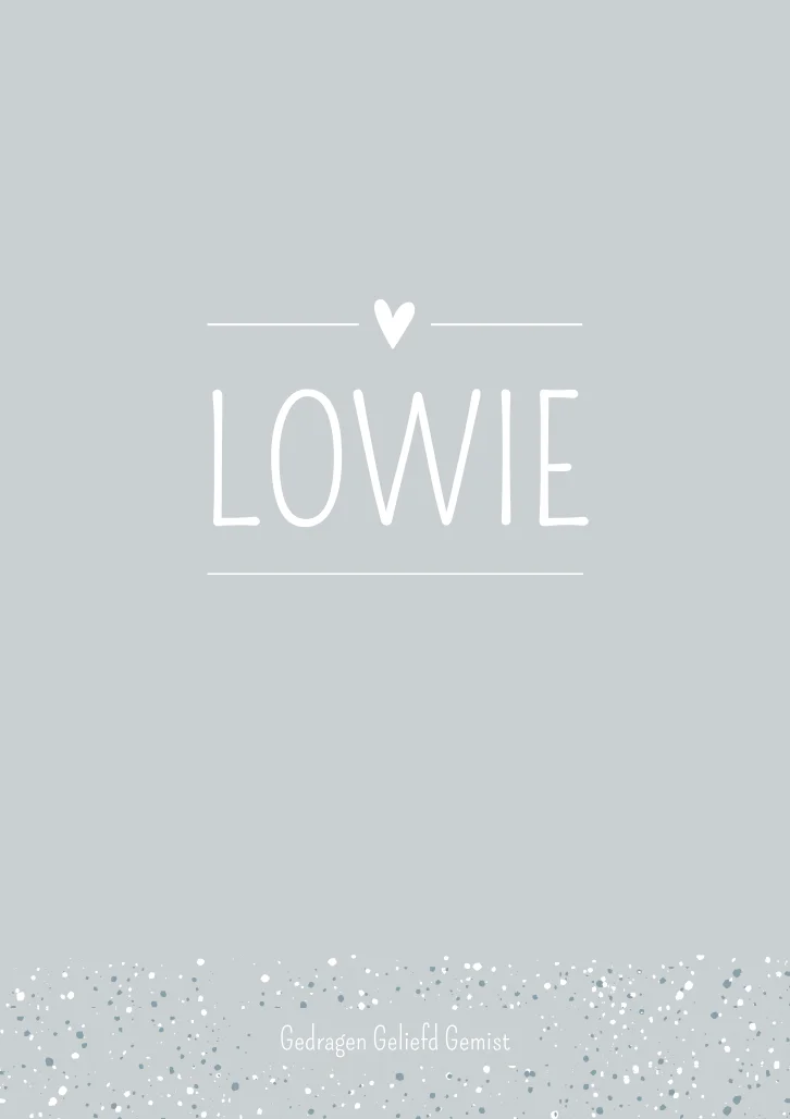 En zacht grijsblauw kaartje met de naam tussen twee strepen en stipjes aan de onderzijde van de kaart. Dit is een modern en tijdloos kaartje.