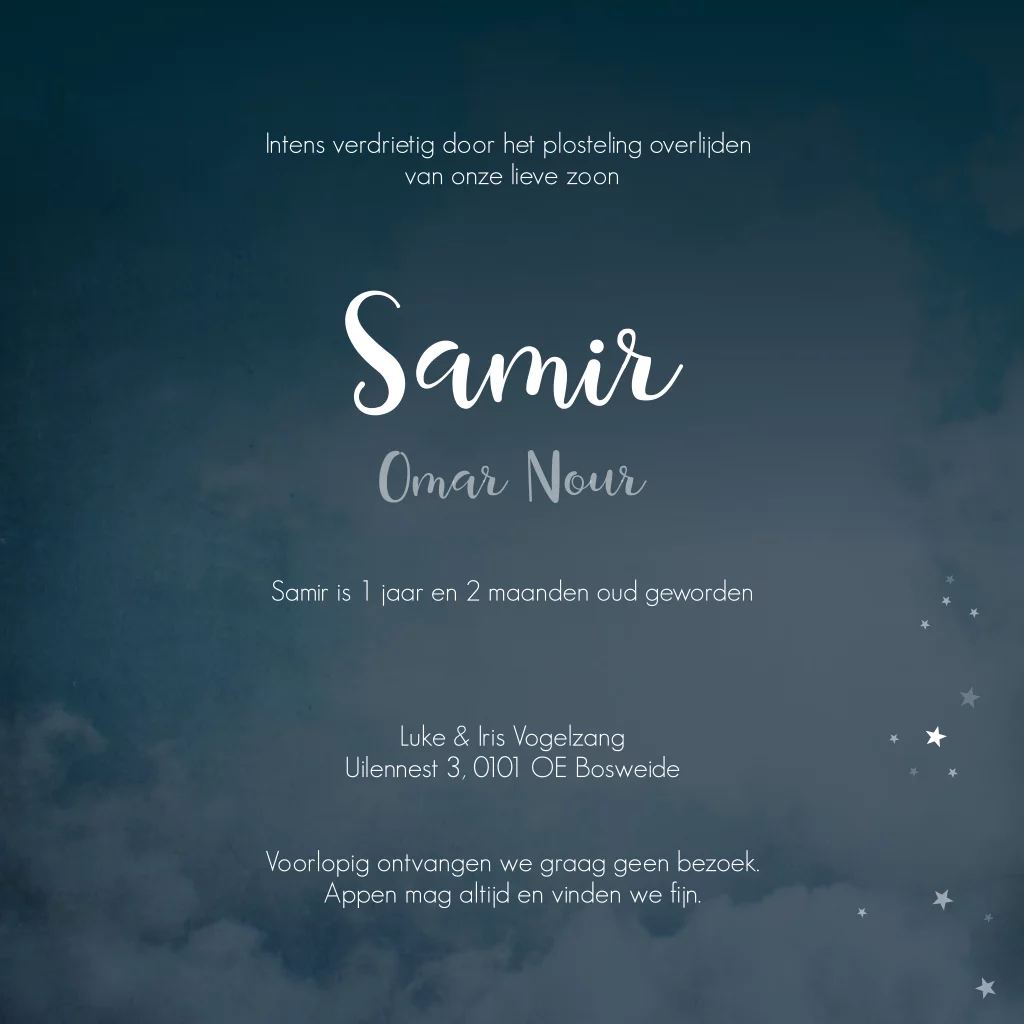 Een donkerblauw kaartje vol met kleine sterren. Deze rouwkaart is prachtig wanneer je deze laat bedrukken met koperfolie. Zo glinsteren de sterren heel mooi.