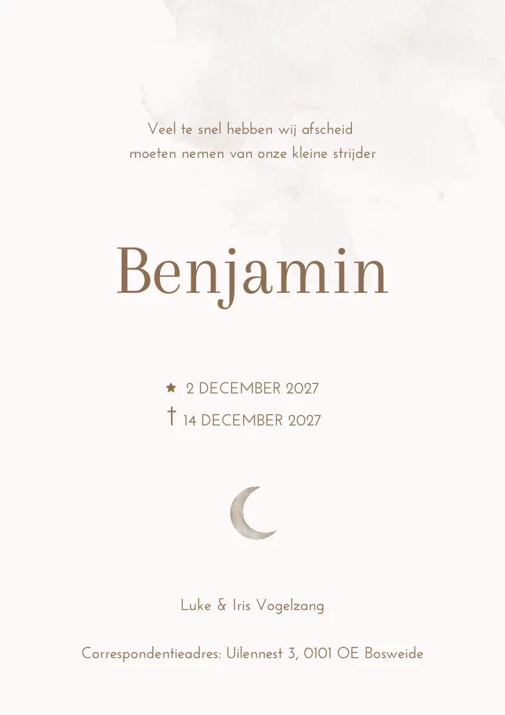 Love you to the moon and back! Een neutraal beige rouwkaartje met een waterverf illustratie van een schattig slapend konijntje op de maan. Het konijntje wordt omringd door kleine sterretjes en op de achtergrond zie je waterverfvlekken. Kaartje Benjamin is heel mooi op gebobbeld papier.