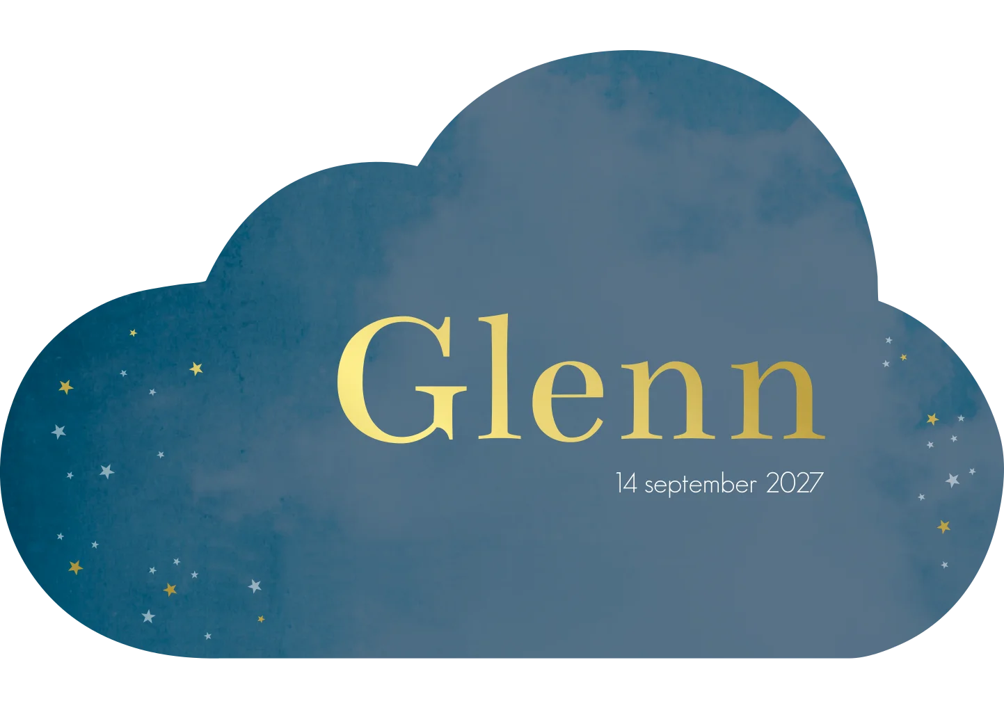 Een donkerblauwe rouwkaart met een gewolkte achtergrond in een wolk vorm. Kaartje Glenn is een dromerig en bijzonder kaartje door zijn vorm. De kleine sterretjes maken het helemaal af.