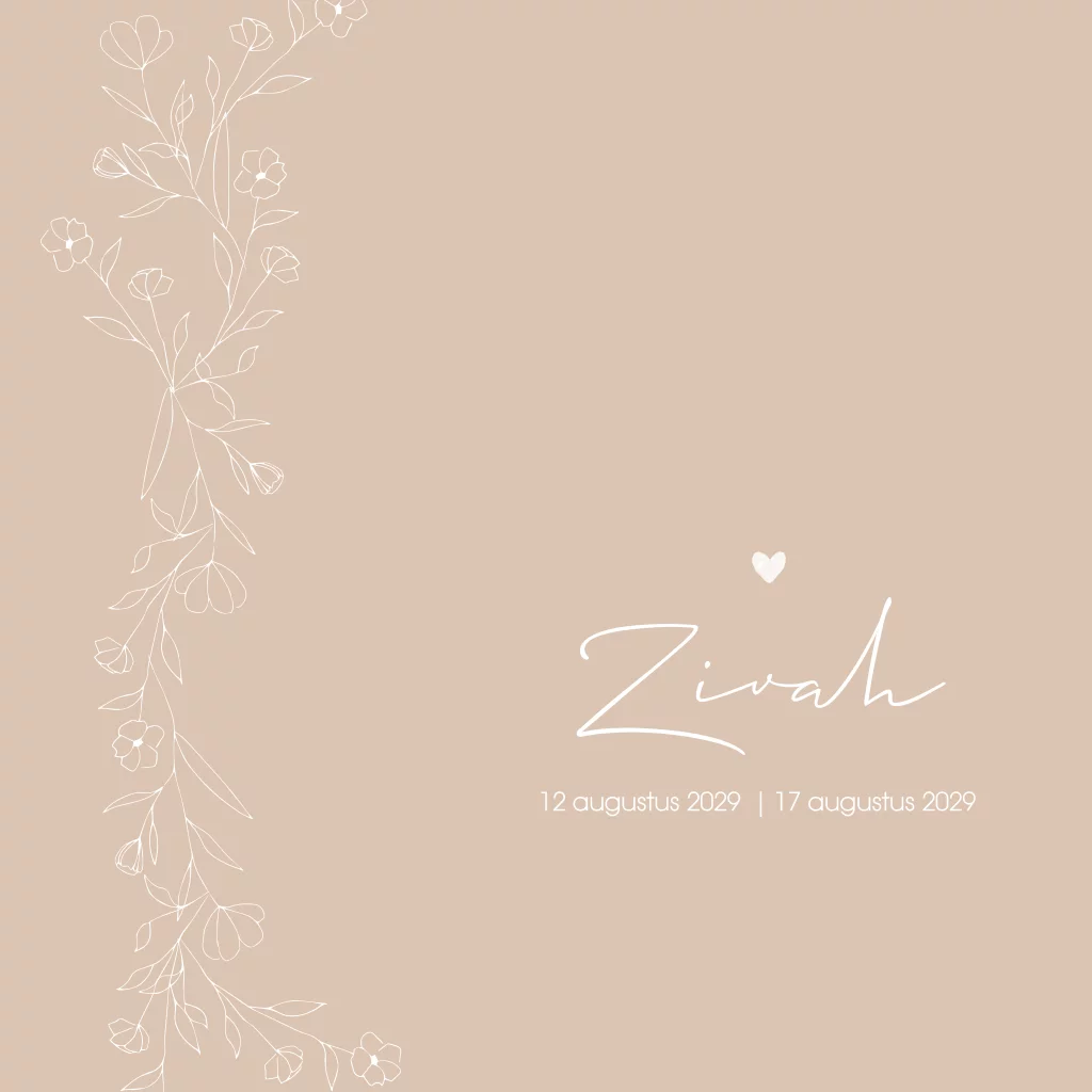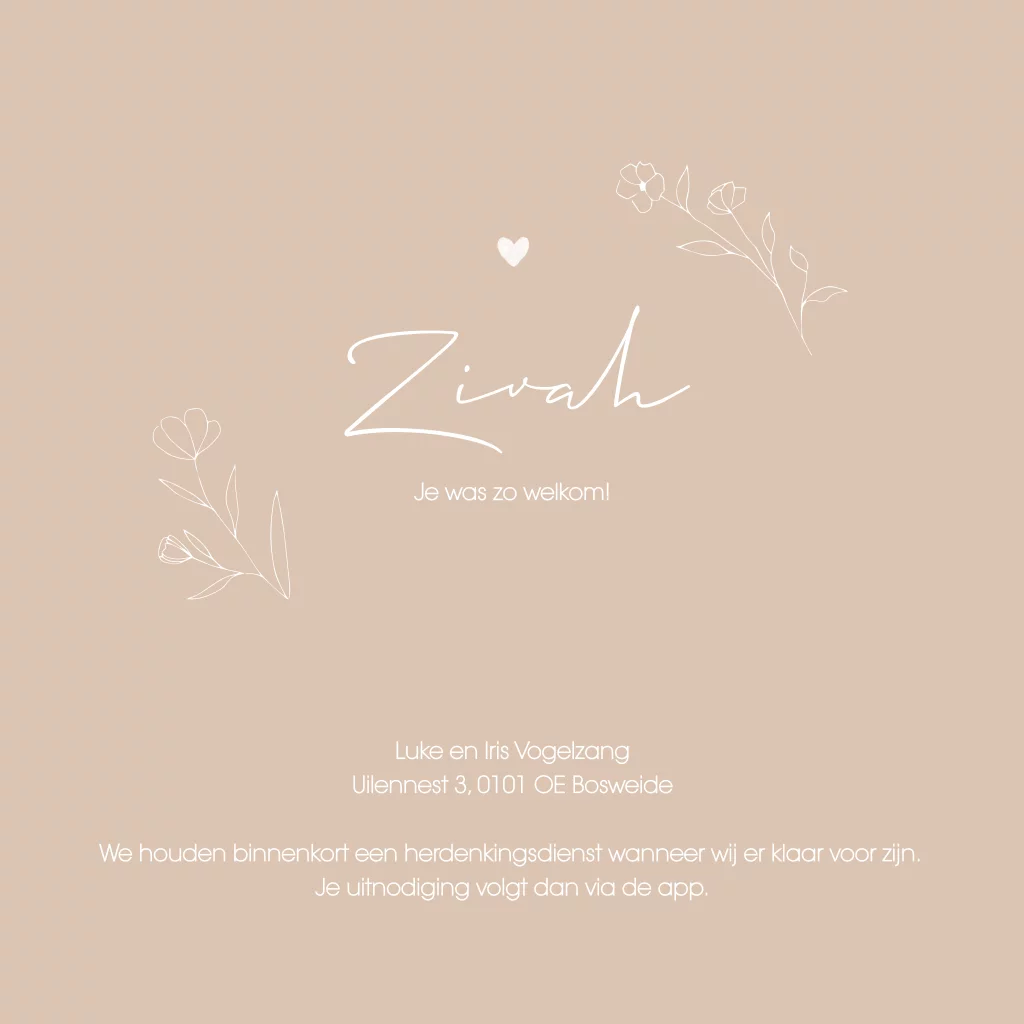 Een lief oud zalm roze rouwkaart met een getekend bloemenveld, bloemenstrook als lijntekeningen. Kaartje Zivah is door de roze kleur extra schattig. De hartjes kun je ook in roséfolie maken, dit kun je makkelijk zelf aanpassen. Kom je er niet uit? App of mail ons dan, we helpen je zsm!