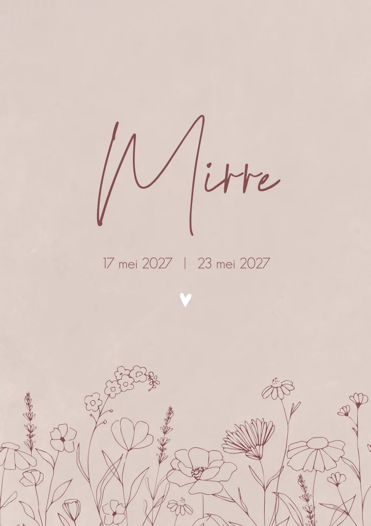Een romantisch rouwkaartje met een bloemenweide in lijntekening. Kaartje Mirre is een lief vergrijsd licht roze kaartje en is erg mooi wanneer je deze laat drukken op gebobbeld papier.