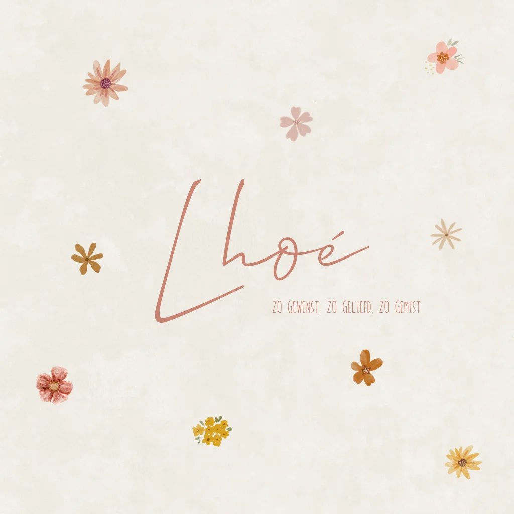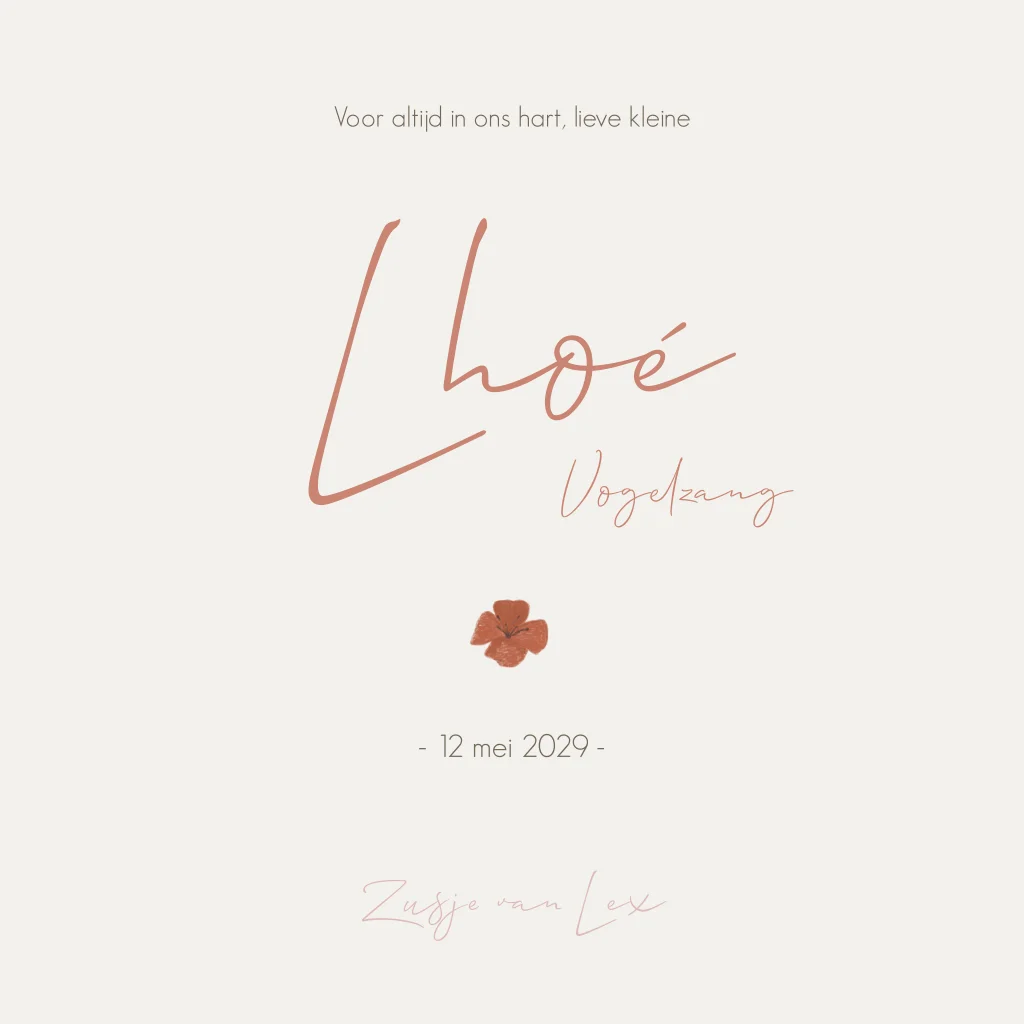 Een beige/ crème velvet/ suède look rouwkaartje Lhoé voor een meisje met allerlei bloemetjes. De bloemen maken het kaartje fris maar ook tijdloos. Je kunt de bloemen zelf aanpassen en neem een kijkje in onze editor om nog meer bloemen te vinden.