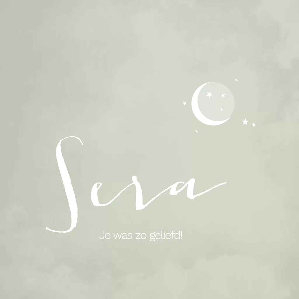 Prachtig kaartje in licht mint groene pastel kleur met wolk achtergrond. Op de kaart is een maantje met sterretjes geplaatst die je in goudfolie kunt laten drukken, zo ook de naam.