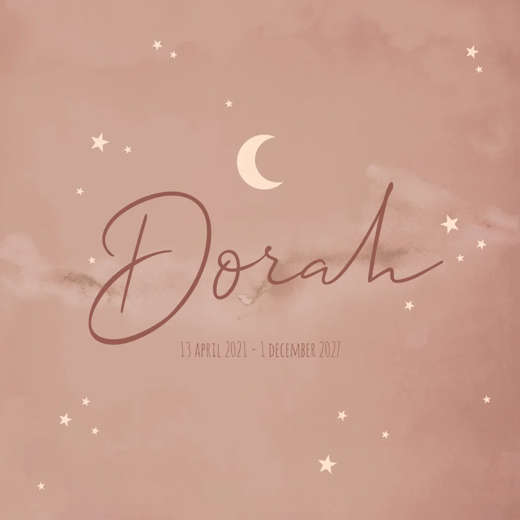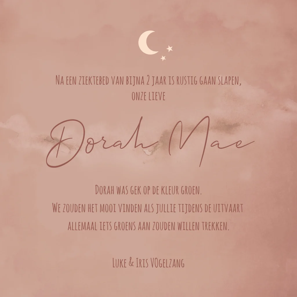 Roze rouwkaartje met wolkjes, sterretjes en maantjes in het thema heelal.