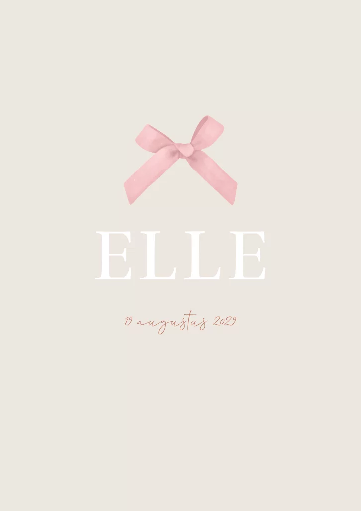 Een klassiek en tijdloze rouwkaart Elle in neutrale en roze kleuren. Het strikje maakt het wat chique. Je kunt alles gemakkelijk naar je wensen aanpassen, ook de kleur van het strikje.