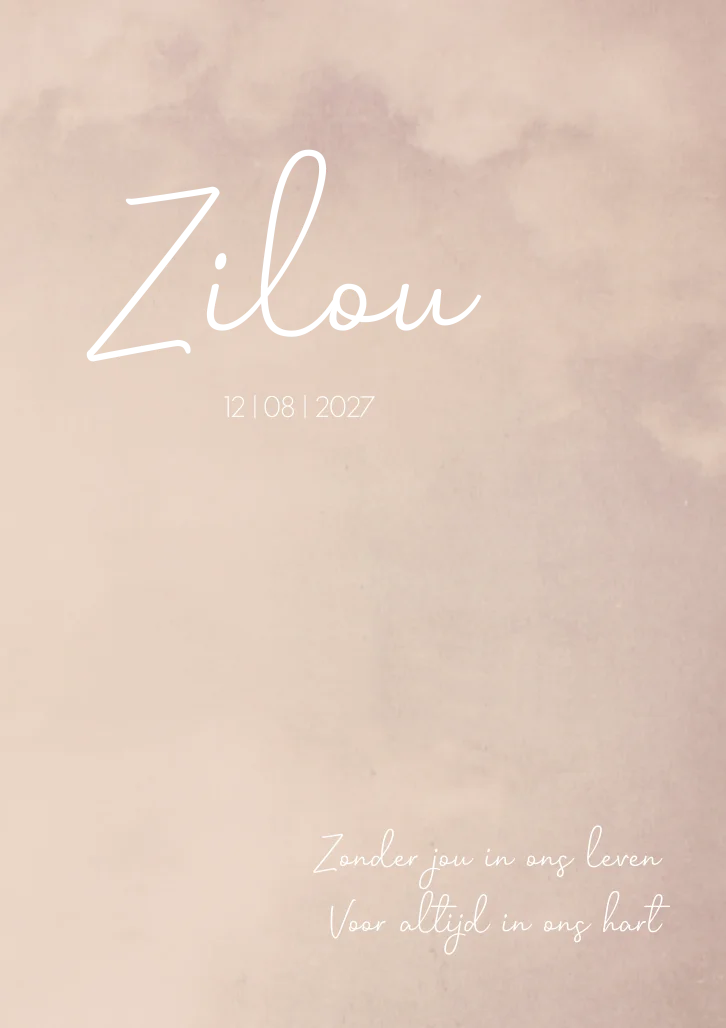 Warm zalmroze peach gewolkt rouwkaartje met koperfolie letters voor de naam. Kaartje Zilou is door de speelse indeling op de achterzijde een bijzonder kaartje.