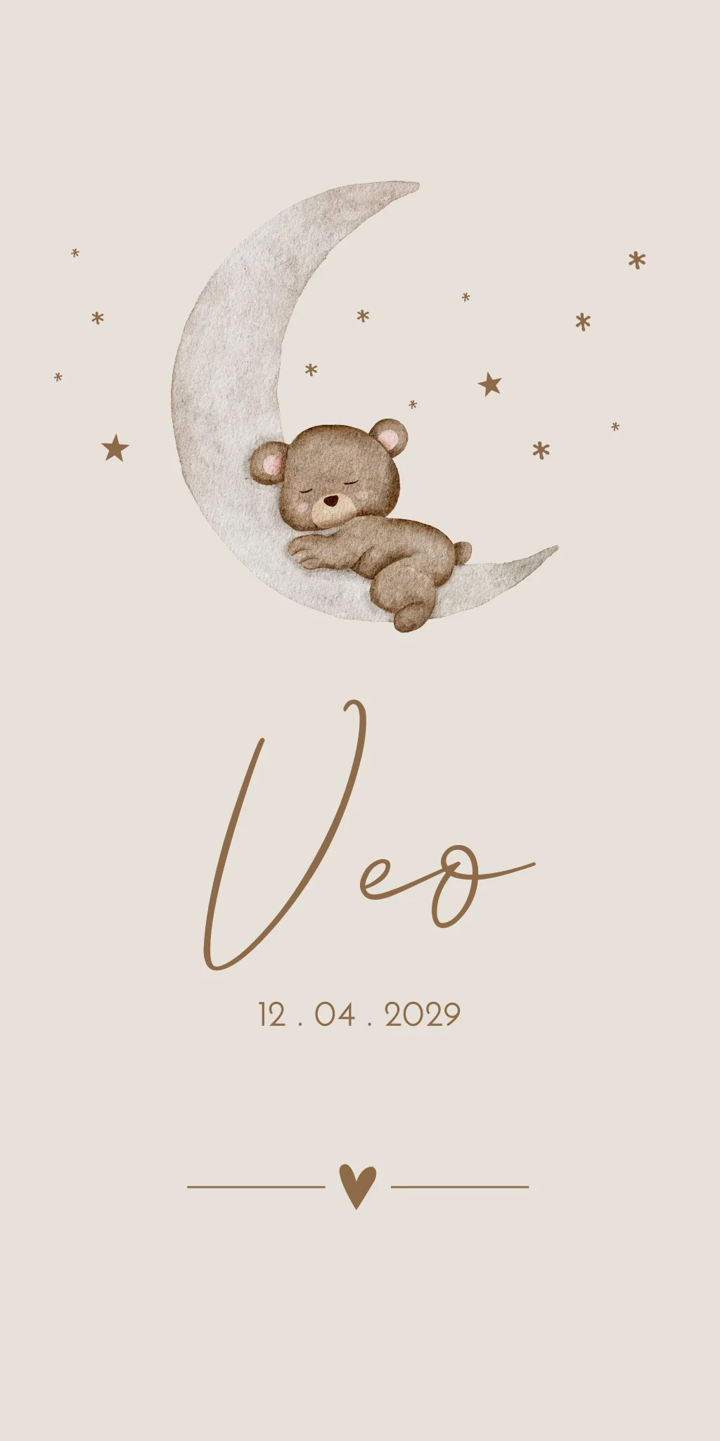 Stijlvolle rouwkaart met een teddybeer in waterverf stijl die ligt de slapen op een maantje. De kaart Veo is in een naturel beige tint, dit is allemaal aanpasbaar in onze online editor.