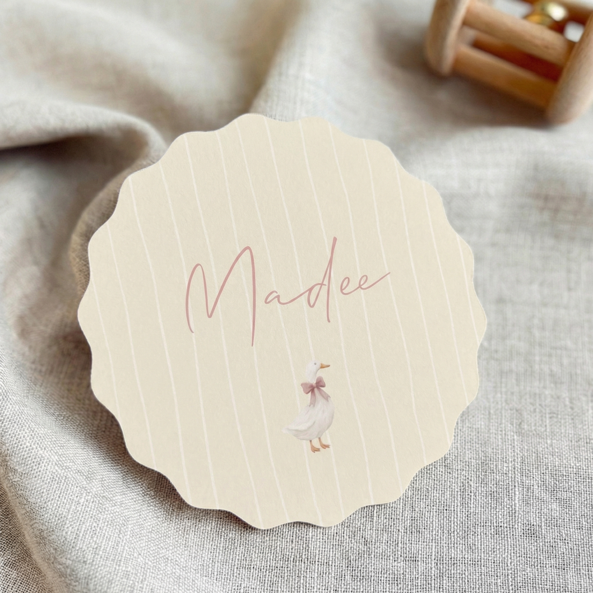 Dit klassieke geboortekaartje bevat een prachtige ronde vorm met boogjes. Het kaartje is zacht geel en heeft witte streepjes. Het gansje en de roze details maken het kaartje romantisch. De kleuren en lay-out van de kaart pas je gemakkelijk aan in de editor.