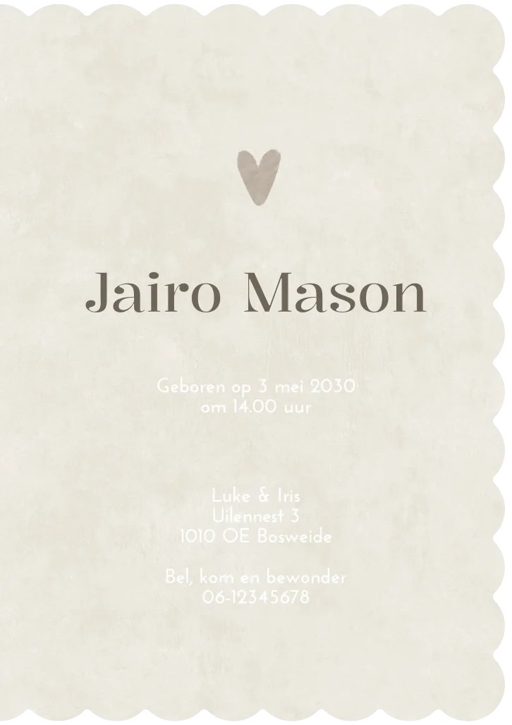 Dit geboortekaartje Jairo heeft een unieke boogjes contour vorm. Het ontwerp en de kleuren kun je heel gemakkelijk aanpassen in de editor.