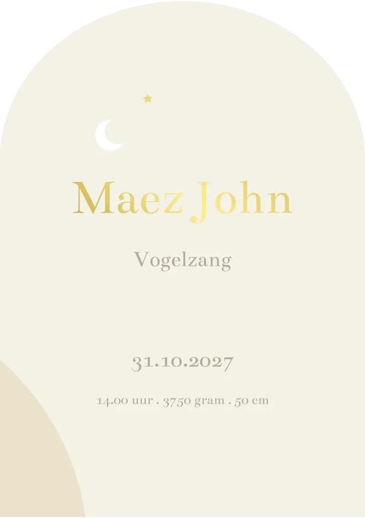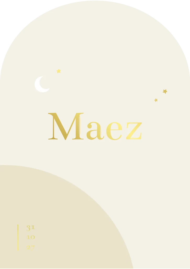 Een trendy beige/ crème neutraal kleurig boogkaartje met goudfolie als accent. Kaartje Maez is een trendy en modern kaartje door de combinatie tussen de klassieke letter en de ronde vormen op het kaartje. De goudfolie maakt het kaartje helemaal af!