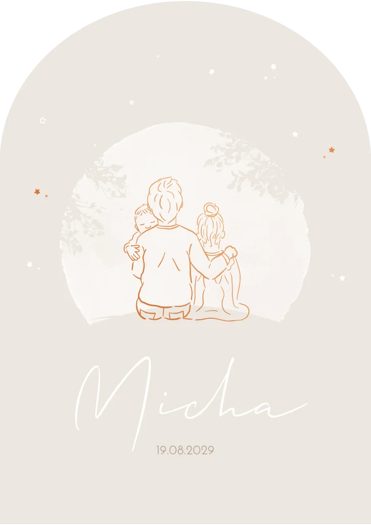 Een beige arch/ boogkaart in naturel tinten met donkerbruin. Op geboortekaartje Micha is een lijntekening van een grote broer, kleine zus en baby broertje te zien. Ziet jouw gezin er anders uit? In onze beeldbank kun je veel meer soorten lijntekeningen vinden.