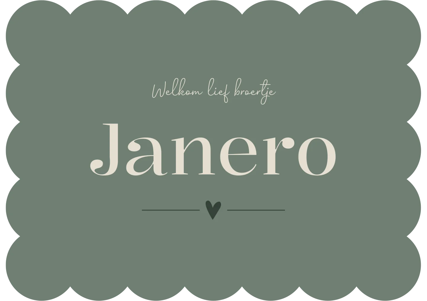 Dit geboortekaartje Janero heeft een unieke koekjes vorm. De hippe vergrijsd groene kleur maakt het een stoer en trendy kaartje. De kleur pas je gemakkelijk aan in onze editor.