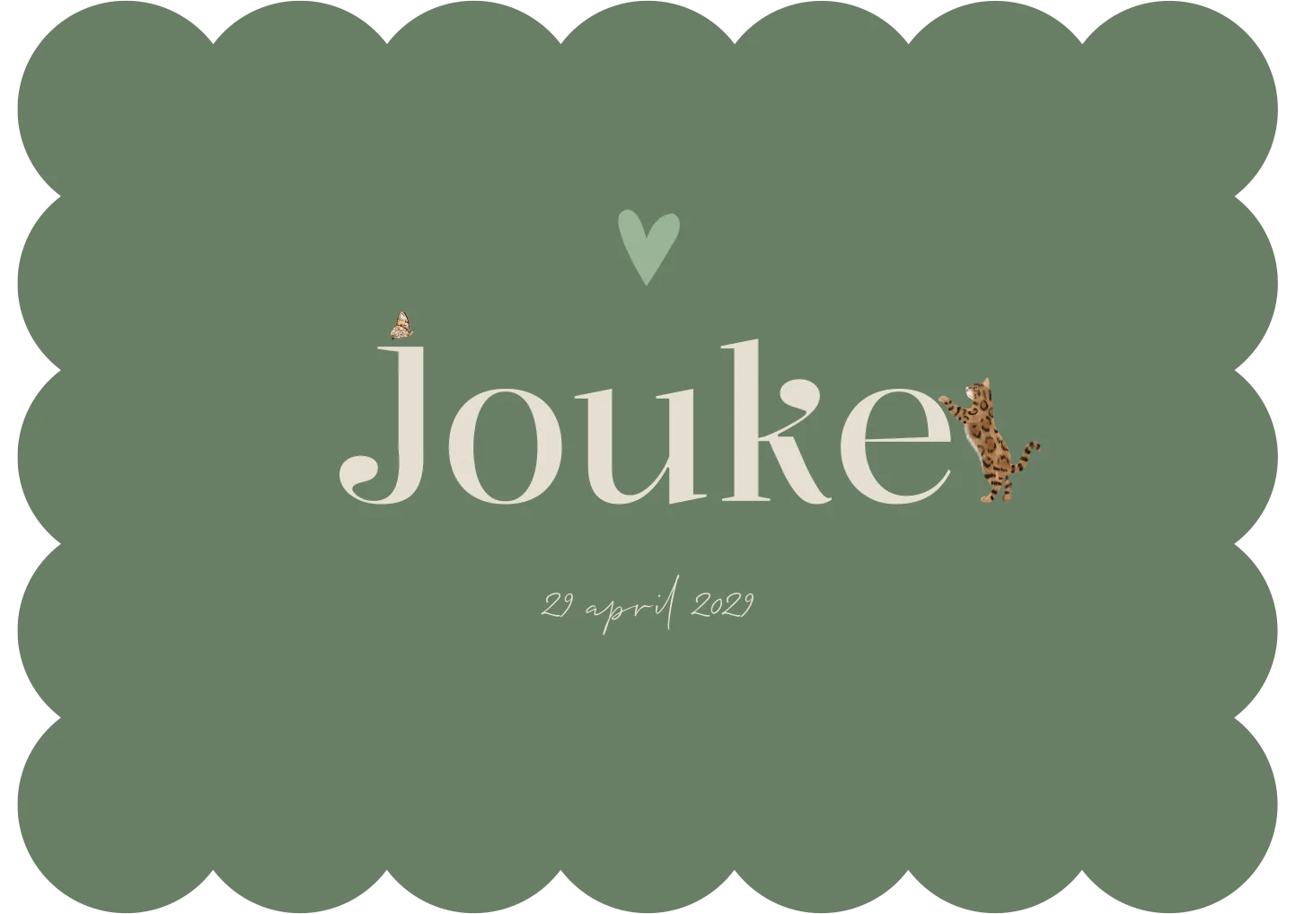 Dit geboortekaartje Jouke heeft een unieke koekjes vorm. De hippe oudgroene kleur maakt het een stoer kaartje. De kleur pas je gemakkelijk aan in onze editor. Ook de dieren kan je vervangen voor andere (huis)dieren.