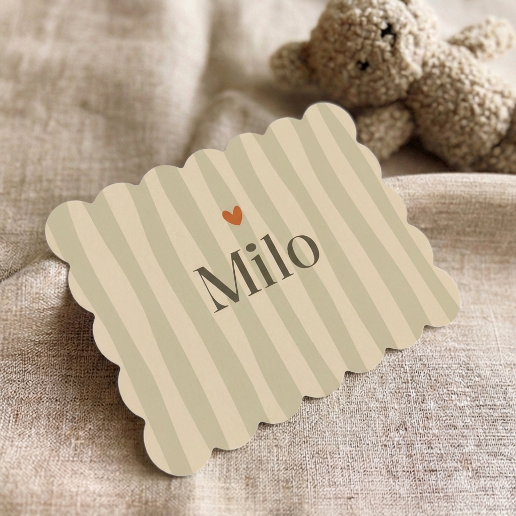 Dit gestreepte geboortekaartje Milo heeft een unieke koekjes vorm. De groene strepen, in combinatie met de beige achtergrond en het oranje hartje, maken het kaartje een trendy ontwerp. De kleur pas je gemakkelijk aan in onze editor.