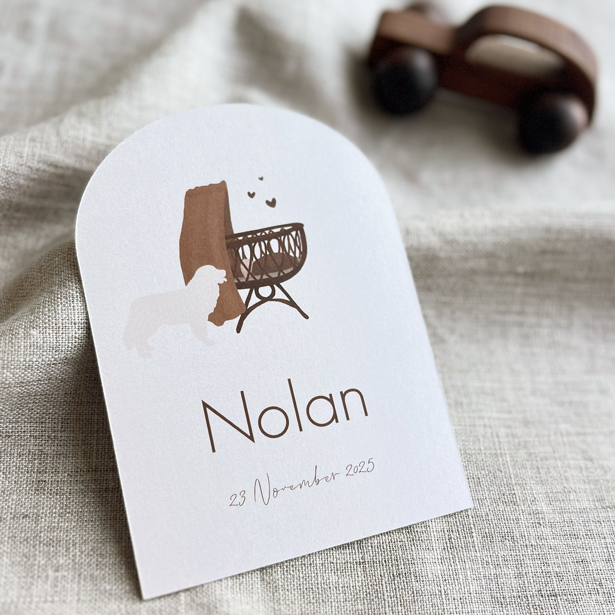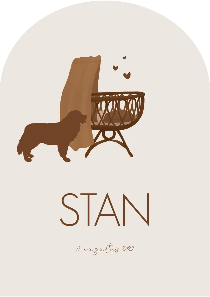 Een beige arch/ boogkaart in naturel tinten met donkerbruin. Op geboortekaartje Stan is een watercolor tekening te zien van een kleine baby in een wiegje en een labrador die bij het bedje staat te kijken. Ziet jouw huisdier er anders uit? In onze beeldbank kun je veel meer soorten illustraties vinden.