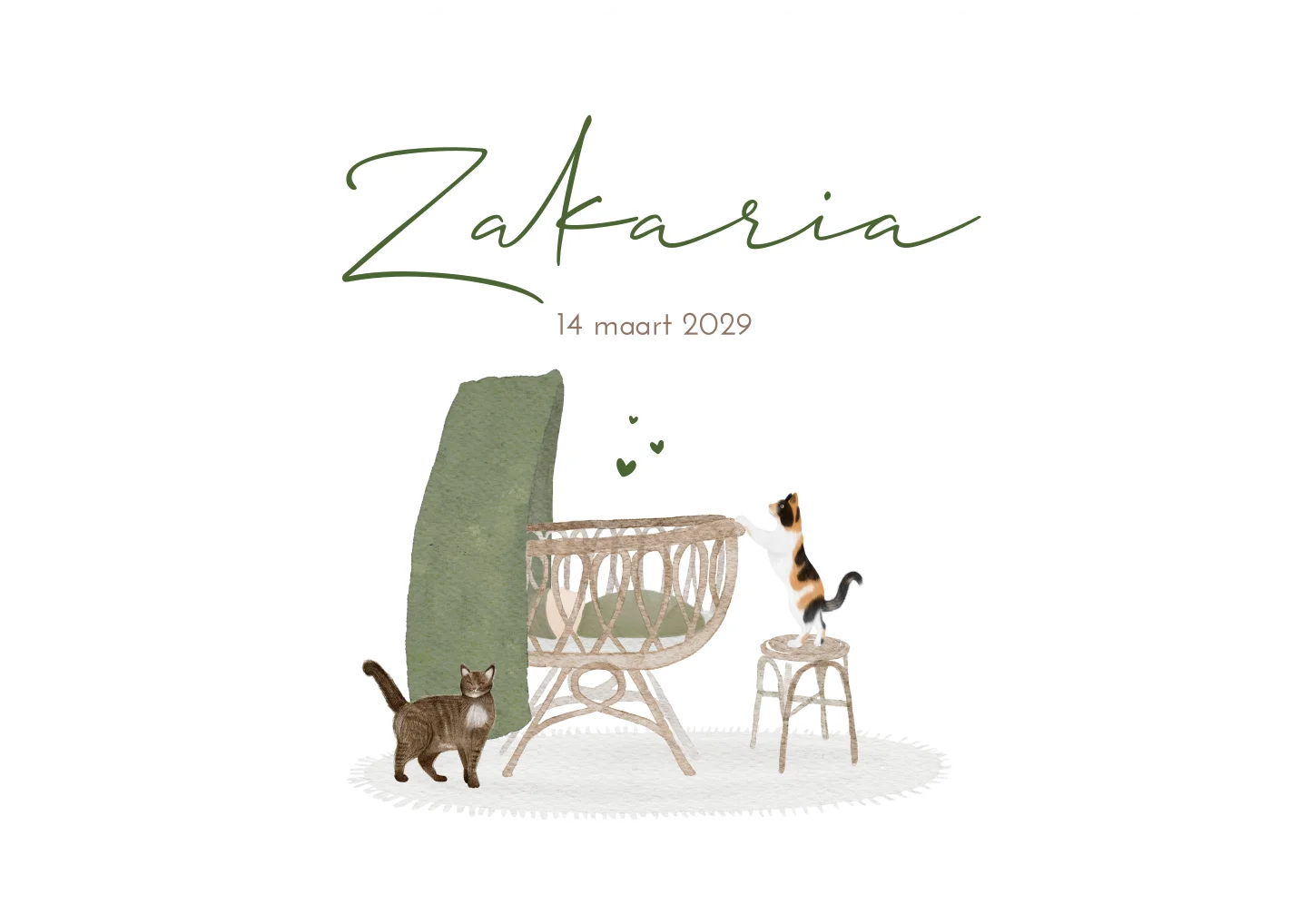 Een schattig geboortekaartje Zakaria, geïllustreerd in watercolor stijl. Op het cookie kaartje in koekjes vorm is een poes die op een krukje staat en in het wiegje kijkt. En er zit een katje naast de wieg te kijken. Ziet jouw kat er anders uit? In onze beeldbank vind je diverse katten. Staat jouw dierenvriendje er niet tussen? Informeer naar de mogelijkheden voor een illustratie op maat!