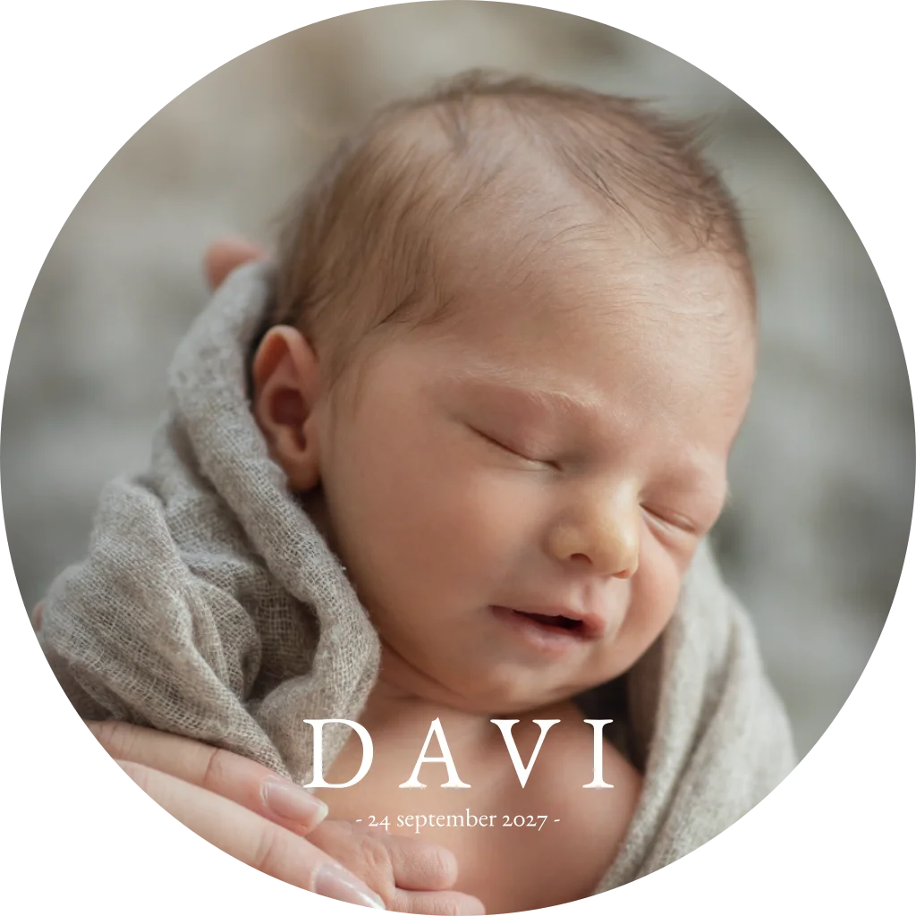 Een tijdloos kaartje in een modern jasje. Kaartje Davi is een prachtig rond fotokaartje. Op de achterzijde van het kaartje staat de naam in goudfolie, zo krijgt het een chique uitstraling. Pas zelf de foto en tekst aan in onze editor om het zo naar jouw wensen te maken. Mocht je nog vragen hebben, neem gerust contact met ons op.