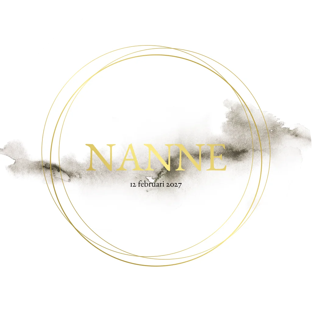 Een wit geboortekaartje in een ronde vorm met een waterverf vlek als toevoeging. Door het gebruik van goudfolie voor de naam en de lijntjes zal dit er extra uitspringen. Kaartje Nanne is daardoor een chique kaartje.