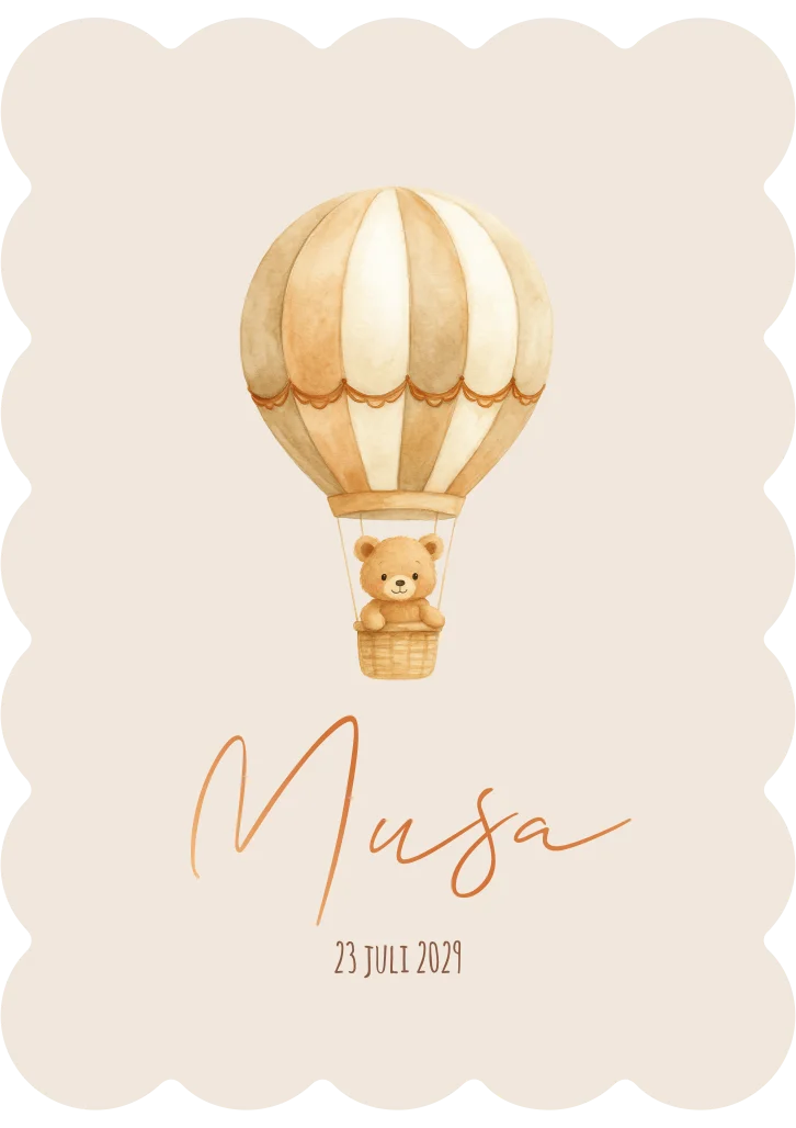 Dit geboortekaartje is gesneden in een cookie vorm. Op de kaart Musa staat een luchtballon met een teddy beertje er in. Je kunt de kleuren van de kaart en de letters eenvoudig aanpassen in de online editor.