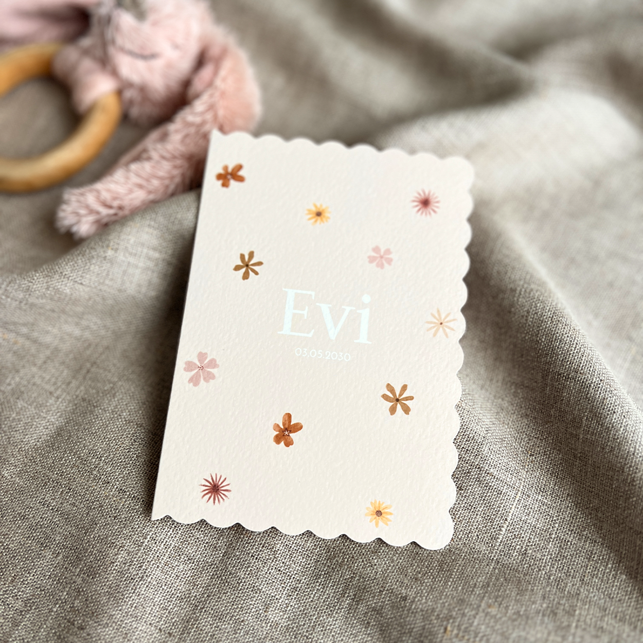 Dit geboortekaartje Evi heeft een unieke boogjes contour vorm. De kaart heeft een prachtige beige achtergrond met daarop mooie gekleurde bloemetjes in roestbruin, roze en geel. Het ontwerp en de kleuren kun je heel gemakkelijk aanpassen in de editor.