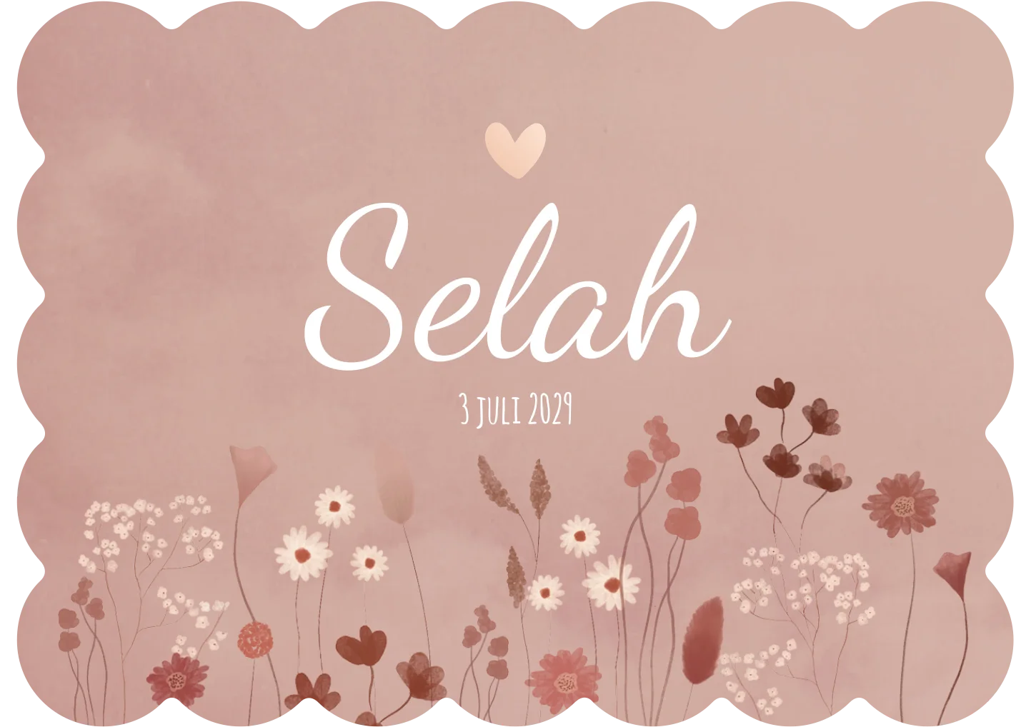 Dit geboortekaartje Selah heeft een roze zachte kleur met allerlei bloemetjes in roze kleurtjes De cookie / koekjes vorm maakt het kaartje uniek! In de beeldbank heb je een grote keus aan bloemen en illustraties.