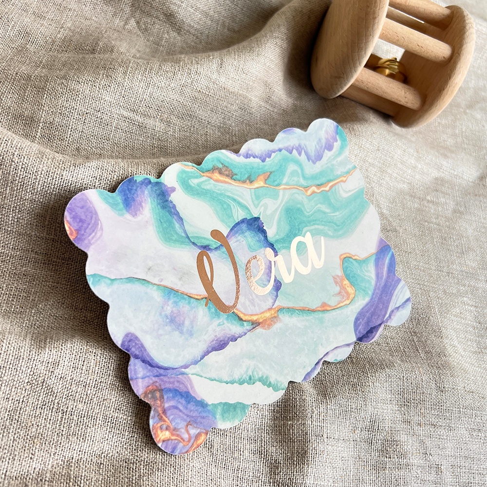 Dit kleurrijke geboortekaartje Rowy heeft een unieke koekjes vorm. De speelse warme kleuren maken het kaartje lekker kunstzinnig en artistiek. Alles pas je gemakkelijk aan in onze editor.