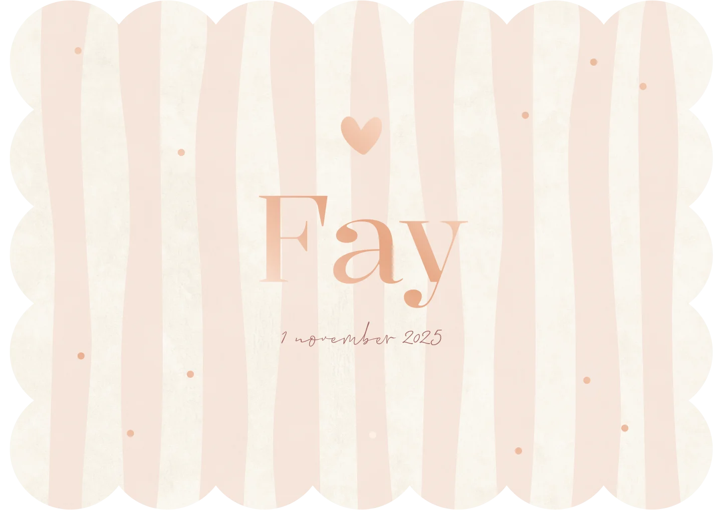 Dit gestreepte geboortekaartje Yesmee heeft een unieke koekjes vorm. De zacht beige kleur met strepen in lichte roze kleur maakt de kaart heel lief en zacht. De stippen in roséfolie maken het ook weer hip. De kleur pas je gemakkelijk aan in onze editor.