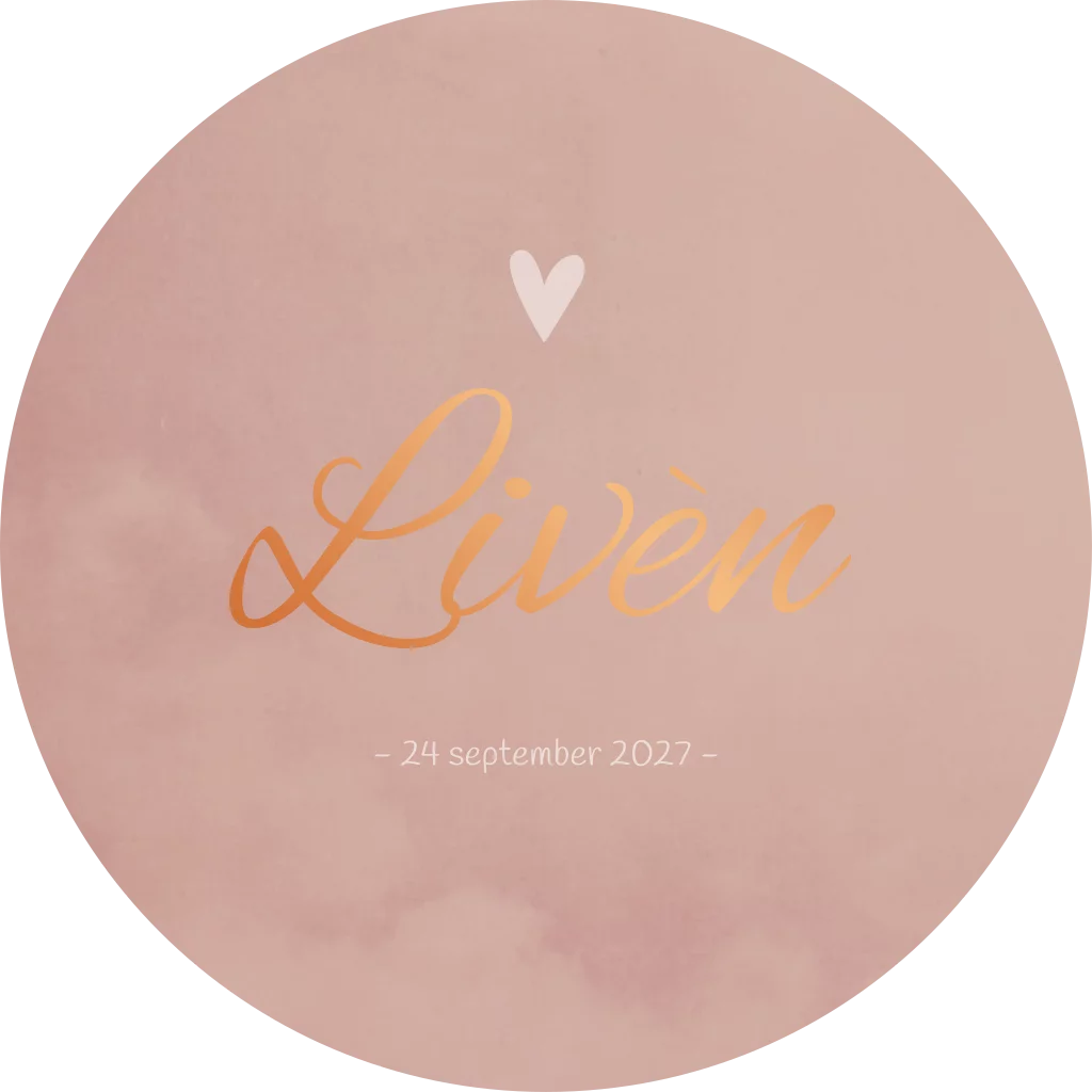 Een romantisch rond geboortekaartje met een gewolkte oudroze achtergrond. Kaartje Livèn wordt extra bijzonder door de koperfolie, zo glimt de naam je tegemoet.