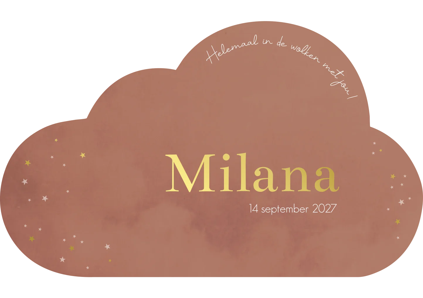 Een oudroze geboortekaartje met een gewolkte achtergrond in een wolk vorm. Kaartje Milana is een romantisch en bijzonder kaartje door haar vorm. De kleine sterretjes maken het helemaal af. Wil je graag iets aanpassen? Neem dan een kijkje in onze editor voor alle opties.