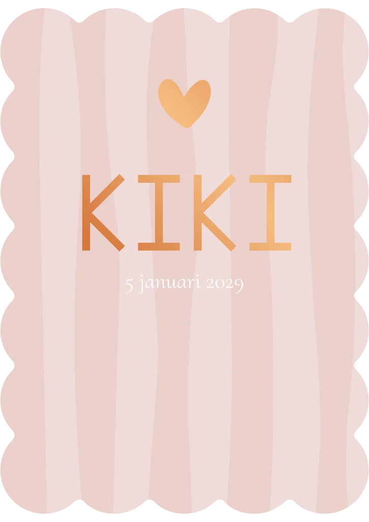 Dit geboortekaartje is gesneden in een cookie vorm. De randen met boogjes maken het kaartje Kiki uniek. Op de kaart staan verticale strepen, die je gemakkelijk van kleur kunt veranderen of kunt verwijderen.