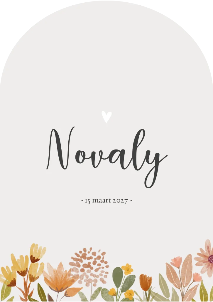 Een vrolijk geboortekaartje met een waterverf bloemenweide. Kaartje Novaly is een kleurrijk boogkaartje. Wil je graag iets aanpassen? Neem dan een kijkje in onze editor voor alle opties.