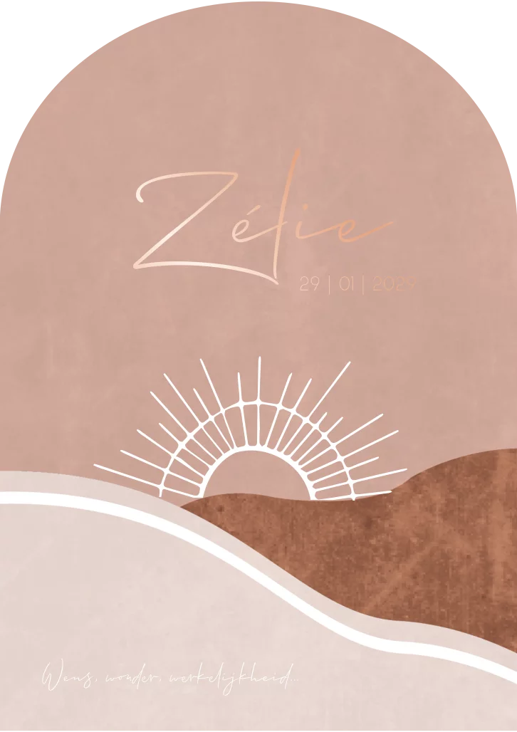 Een artistiek geboortekaartje Zélie waar je een berglandschap in kunt zien of trendy kleurvlakken in roze tinten met witte lijnen. De lijntekening van de zon kun je ook in roséfolie laten drukken. Het kan ook symbool staan voor licht na donkere tijden.