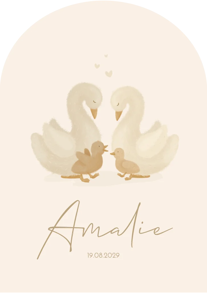 Een boogvormig kaartje met daarop een zwanen / ganzen familie. De kleine vogels zijn te dupliceren of te verwijderen, als dit past bij je gezinssamenstelling. De beige kleuren op de kaart kun je gemakkelijk aanpassen in de editor.