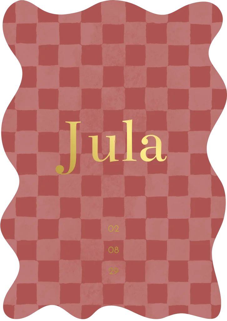 Geboortekaart Jula is uniek in haar soort met de golvende randen en het blokjes patroon. De rood paarse kleuren kun je heel makkelijk aanpassen en ook het goudfolie kan omgezet worden naar een andere (folie)kleur.