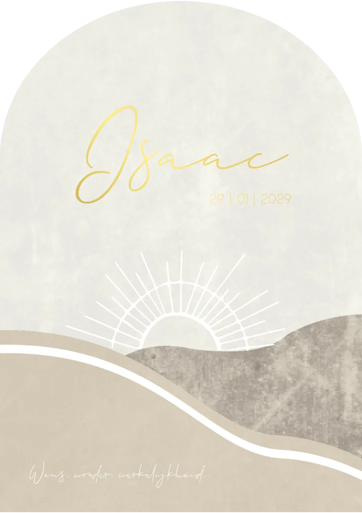 Een artistiek geboortekaartje Isaac waar je een berglandschap in kunt zien of trendy kleurvlakken in beige/ crème/ bruine tinten met witte lijnen. De lijntekening van de zon kun je ook in goudfolie laten drukken. Het kan ook symbool staan voor licht na donkere tijden.