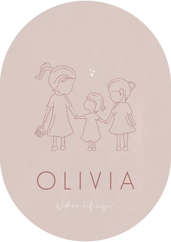 Een ovaal geboortekaartje met een oudroze achtergrond en een lijntekening van drie zusjes. Kaartje Olivia is de perfecte combinatie tussen modern en romantisch.