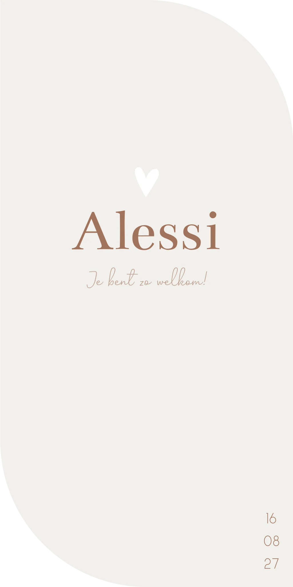 Een lichtbeige/grijs kaartje met een bijzonder vorm met ronde hoeken. Kaartje Alessi is door haar klassieke lettertype en kleurgebruik een tijdloos kaartje. Door de bijzondere stans vorm krijgt het kaartje een speciale touch.