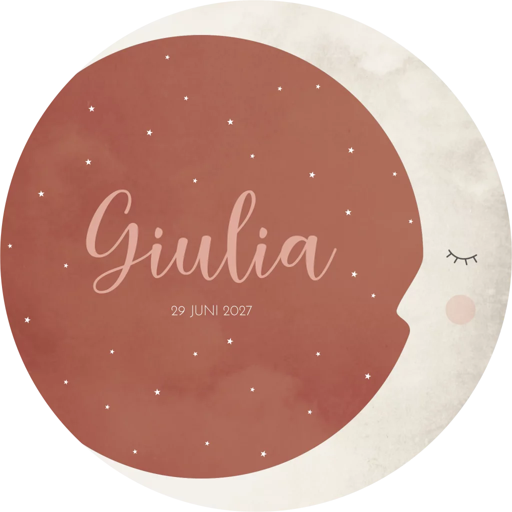 Een romantisch rond geboortekaartje. Kaartje Giulia is een rond kaartje met een roestrode cirkel omringd door een beige maantje. Op het kaartje staan sterretjes en de naam staat in het roze. Wil je graag iets aanpassen of toevoegen aan het kaartje, zoals bijvoorbeeld een hartje? Neem dan een kijkje in onze editor voor alle mogelijkheden.