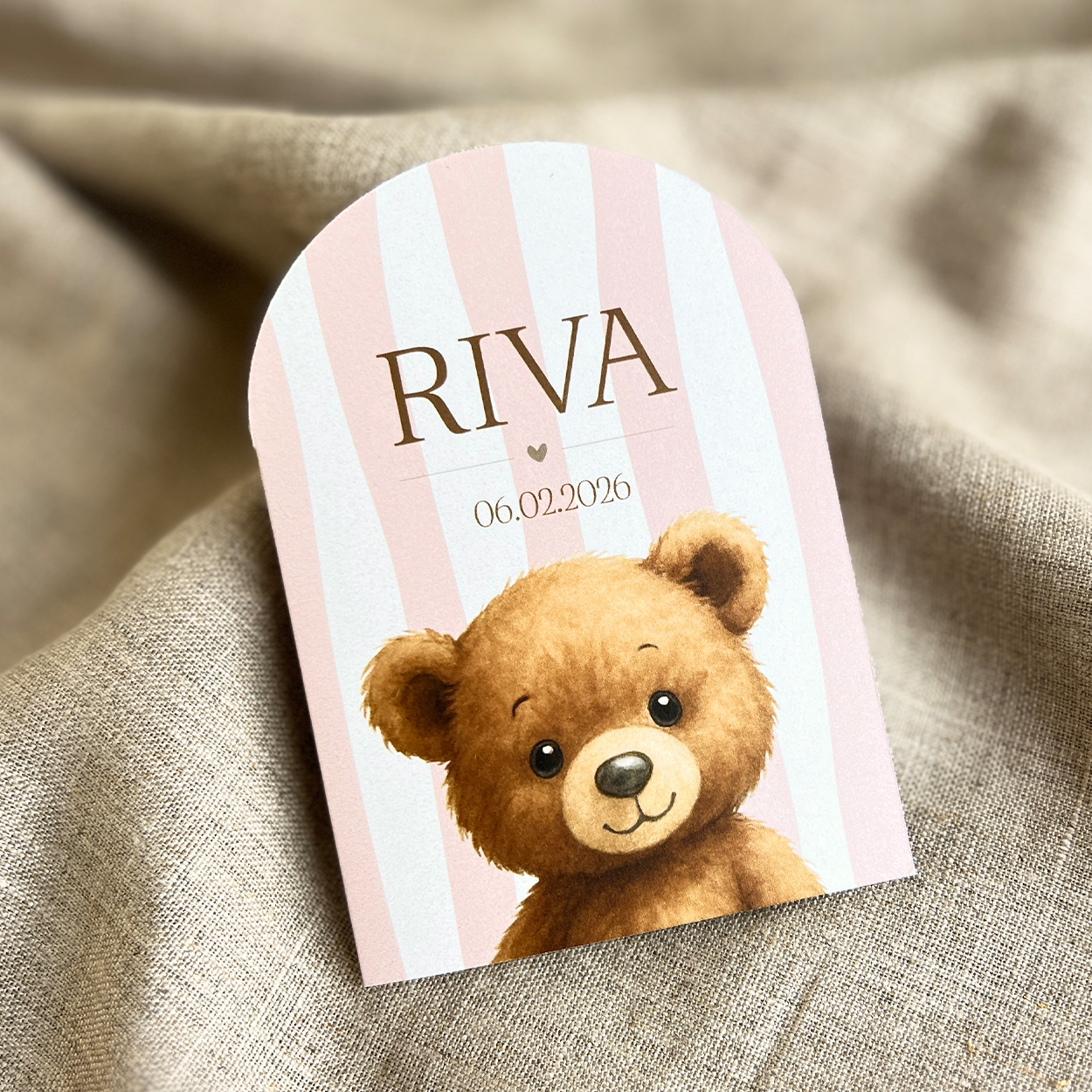 Een Roze met wit gestreept geboortekaartje. De streepjes zorgen voor een trendy uitstraling en de Teddy Beer maakt het helemaal hip. De boog vorm maakt het kaartje stijlvol en chique. Je kunt dit ontwerp van babykaartje Fréle helemaal zelf aanpassen qua kleur, opmaak en lettertype.