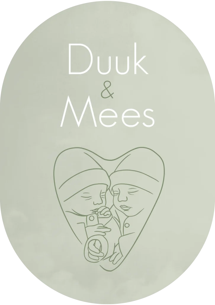 Een ovaal geboortekaartje met een zacht groene achtergrond en een lijntekening van twee broertjes. Kaartje Duuk & Mees is de perfecte combinatie tussen modern en stoer, supermooi voor een tweeling!