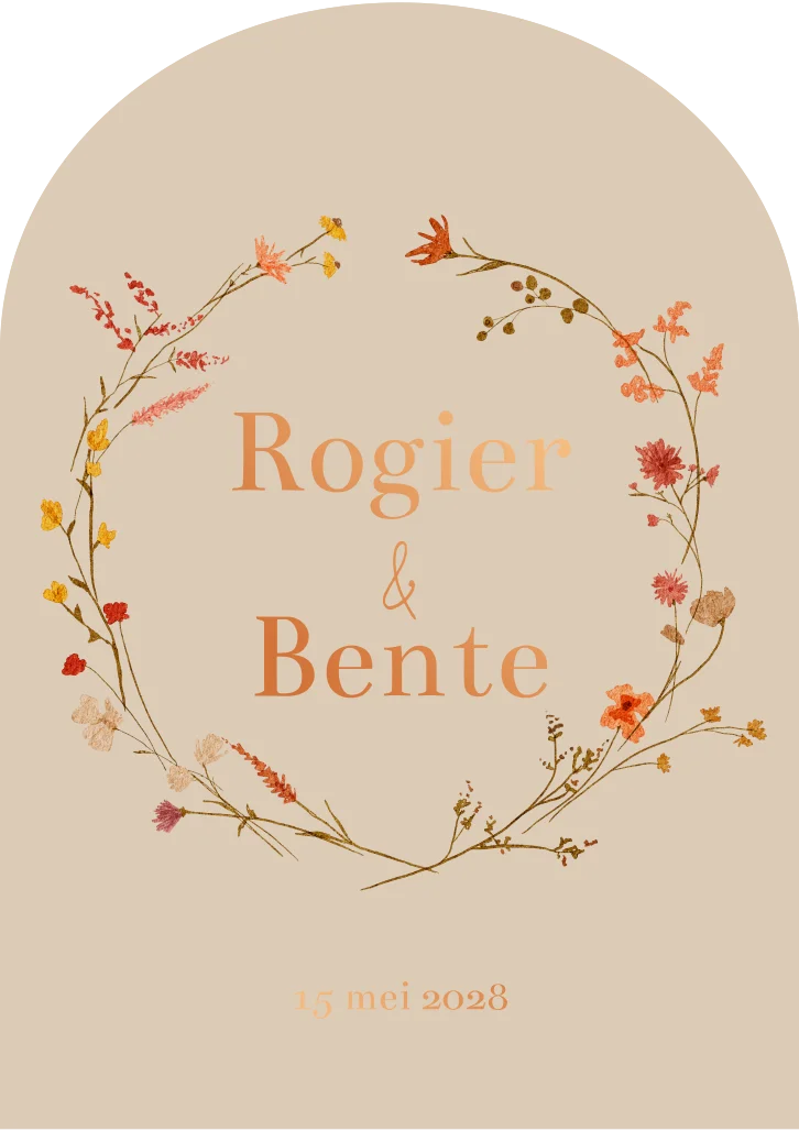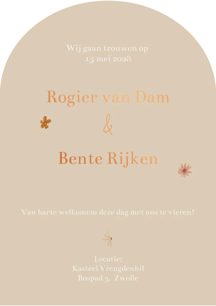 Trouwkaart in boogvorm met bloemenkrans. De kaart is bedrukt met koperfolie. Pas de kaart naar eigen wens aan in de editor.