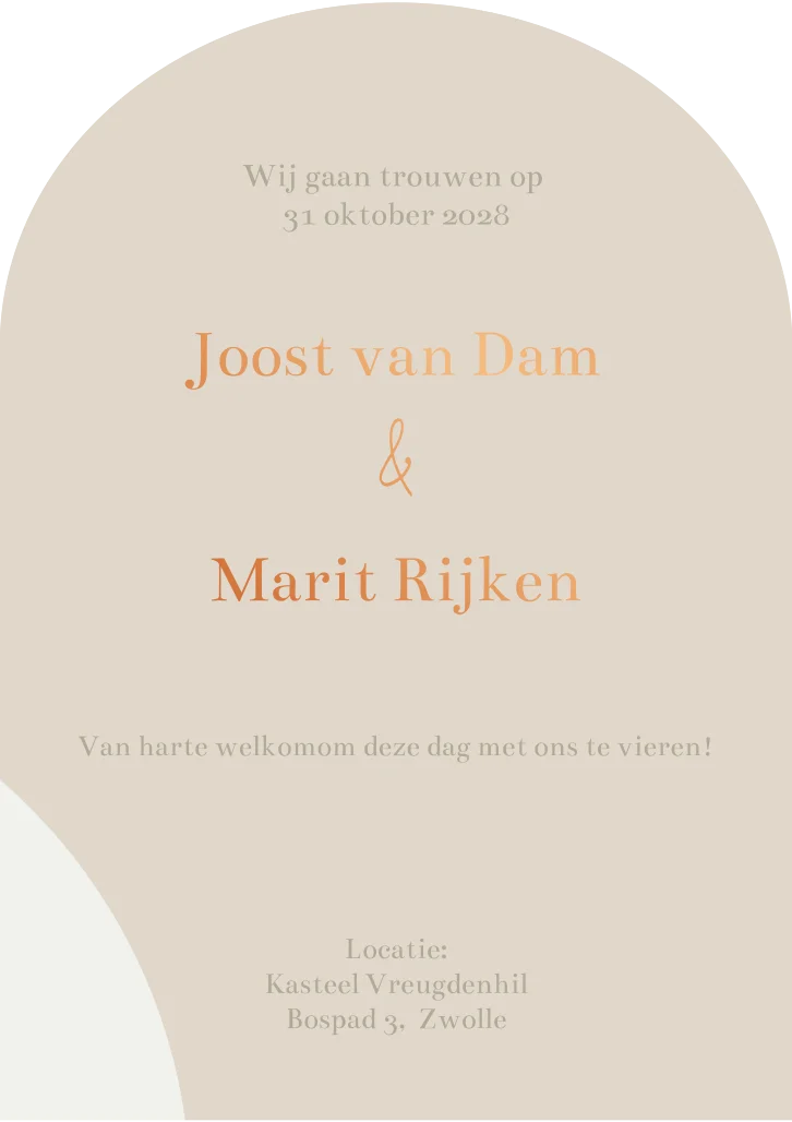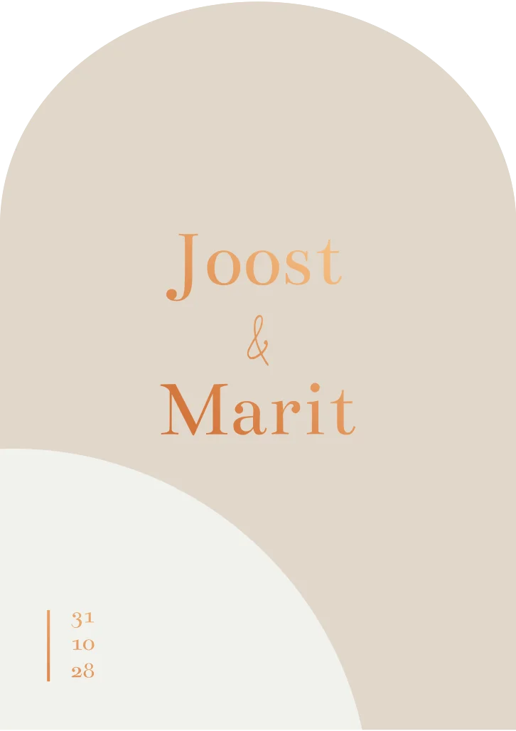 Trouwkaart in boogvorm in beige tinten. Deze trouwkaart is bedrukt met koperfolie. Liever een andere kleur folie of geen folie? Dat kan, je kunt de trouwkaart naar eigen wens aanpassen in de editor.